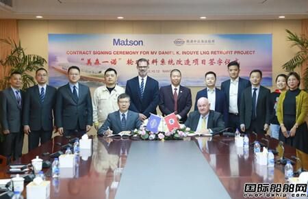 10月12日,南通中遠海運船務與美森輪船(Matson)簽訂“美森一諾(Daniel K. Inouye)”輪LNG雙燃料供氣系統改造項目訂單,再一次凸顯企業在雙燃料改裝市場的突出實力。該船型長260.3米、型寬35米、型深21米、吃水12.2米,重 48908噸,共3653箱。此次主要工程為主機和4臺輔機安裝LNG雙燃料供氣及控制系統,改造6個撬塊安裝的艙室,安裝3只1350立方米LNG燃料罐,