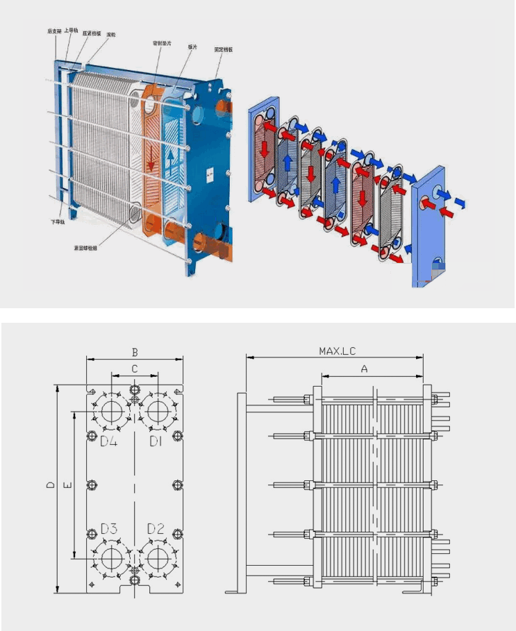 Heat or cool a fluid medium by transferring heat from one liquid to another. The gasketed plate heat exchanger is composed of a series of corrugated plates, which are assembled between the frame and the pressure plate. and the gasket acts as the seal between the plates. The fluid on both sides of the plate usually flows counter current through the heat exchanger, which can achieve the same working condition of the shell-tube heat exchanger. This provides the most efficient heat transfer performance to achieve very close temperature difference,In other word, the temperature difference between the outlet and inlet medium is come to small. In the removable plate heat exchanger with gaskets, the plates are equipped with elastic gaskets, which seal the channel and guide the medium to the spare channel. The plates are assembled between the frame plates and the pressure plates and compressed by tightening the bolts installed between these plates. The channel plate and pressure plate are suspended from the upper bearing rod and fixed in place by the lower guide rod, which is fixed on the pillar.This design is easy to maintain and adjust the heat exchange by reducing or adding plates. The reasonable matching of the plate ripple angle can greatly improve the heat exchange effect per unit heat exchange area, adjust the liquid resistance, save the heat exchange area, reduce the investment cost and shorten the investment recovery time. The flow, physical properties, pressure drop and temperature difference of the liquid determine the number and size of the plates. The chemical properties and corrosion characteristics of the liquid determine the materials of the plates and gaskets.Different corrugated plate structure designs not only improve the turbulence, but also form many supporting points, which can withstand the pressure difference between the media.